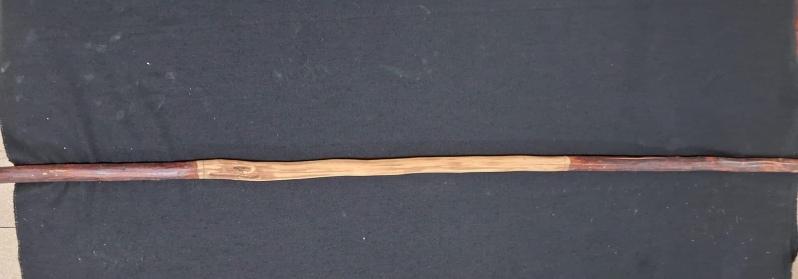 Estaca de madeira roliça confeccionada com madeira não identificada, apresentando faixas nas cores vermelha, preta e branca, sendo que a faixa branca exibe pequenos pontos. A estrutura é predominantemente reta, com superfície levemente irregular. Na extremidade proximal, há um tufo de algodão fixado com amarração. A extremidade distal possui uma seção esbranquiçada.