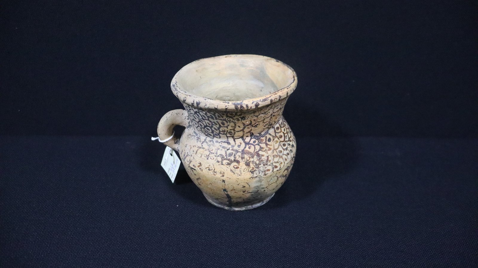 Jarra provida de alça, gargalo, borda reta, bojo de contorno simples e base plana. Confeccionado segundo a técnico do acordelado exibindo gargalo e bojo decorados com padrão característico do povo com tinta natural de Kumatê.