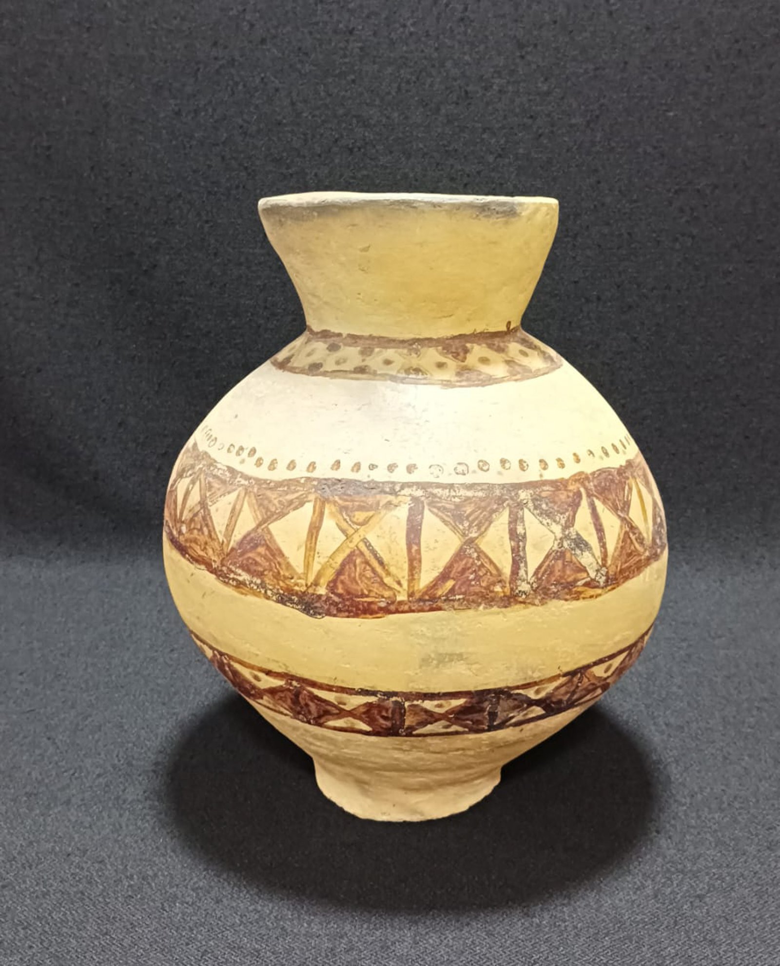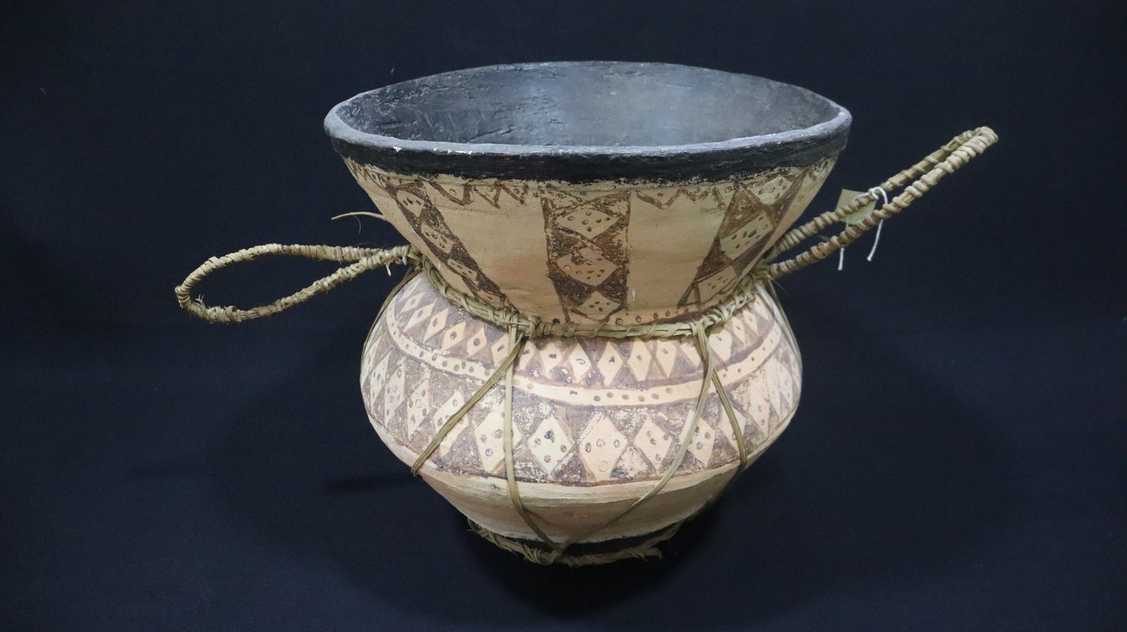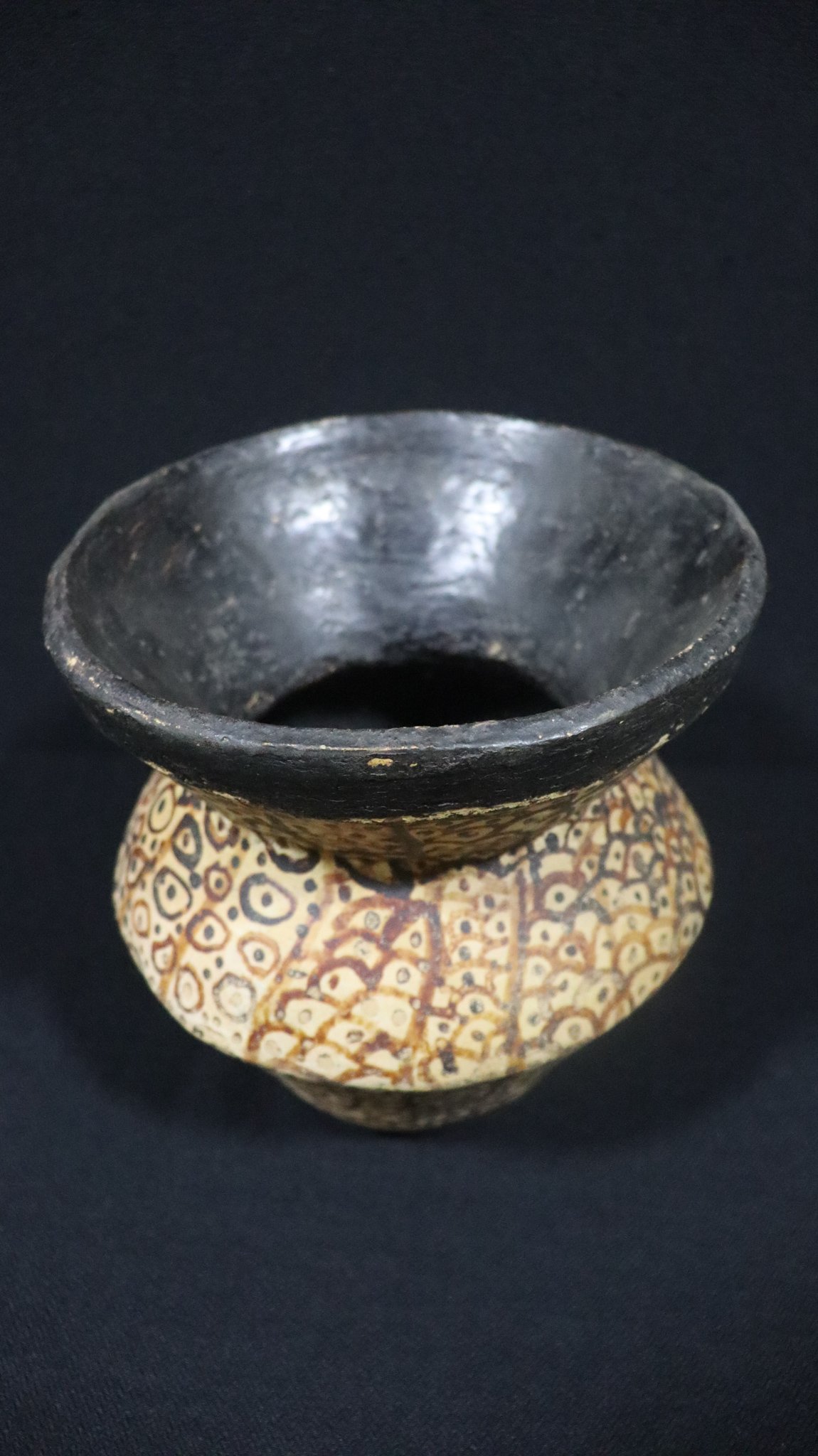 Vaso em forma trapezoidal, acordelado com roletes de pasta de barro misturado com cinzas de caripé e base arredondada, gargalo estreito, borda com abertura superior circular. Pintado com tinta natural de Kumatê.
