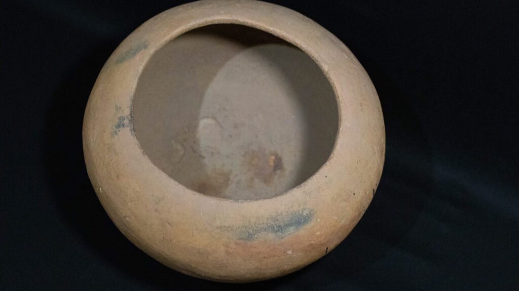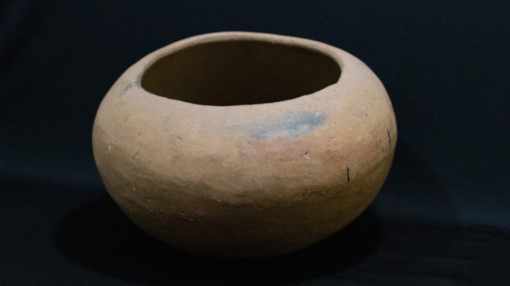 Pote de conformação esférico apresentando borda reta, bojo de contorno simples e base plana. Confeccionado segundo a técnico do acordelado.