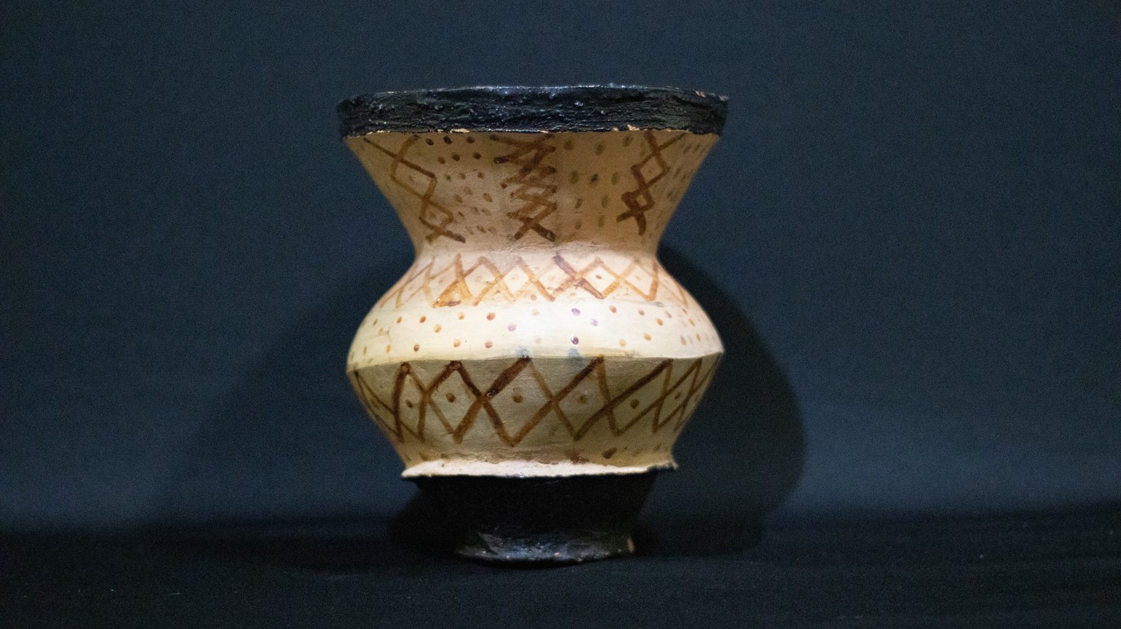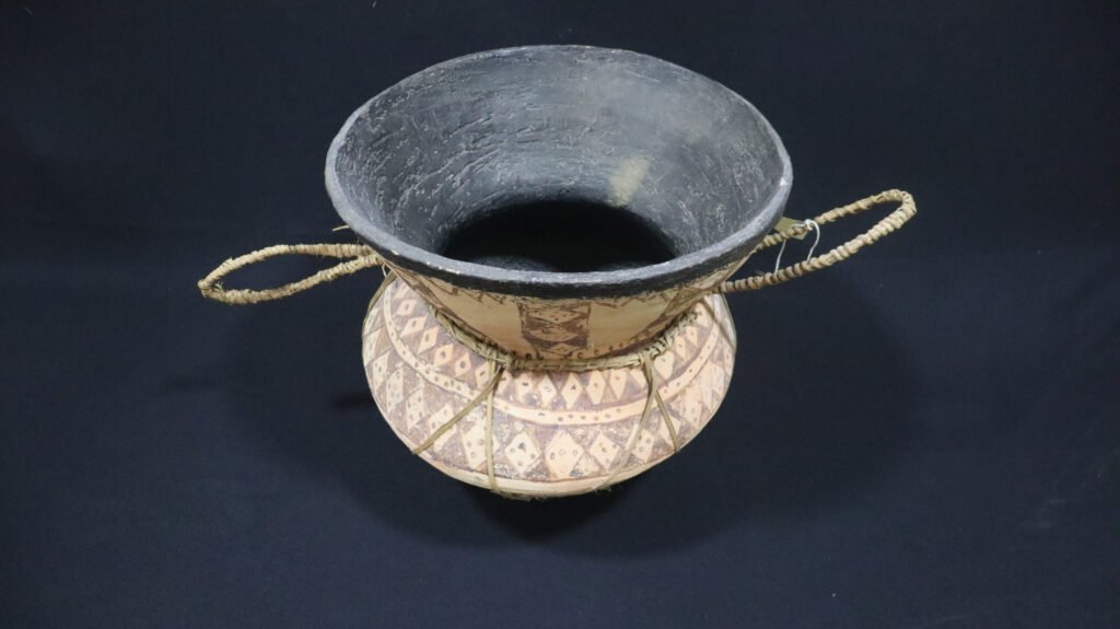 Pote de conformação trapezoidal, apresentando borda reta, bojo de contorno carenado e base plana, confeccionado segundo a técnico do acordelado. Apresenta parte externa decorada com motivos geométricos característicos do povo Palikur e interna tingida com breu. Possui alças constituídas de fibra natural torcida situada entre o bojo e o gargalo sendo que a fibra se estende pelo bojo e base do pote.