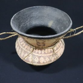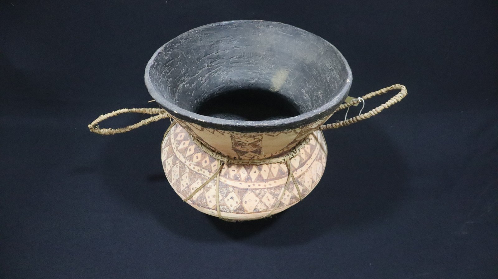 Pote de conformação trapezoidal, apresentando borda reta, bojo de contorno carenado e base plana, confeccionado segundo a técnico do acordelado. Apresenta parte externa decorada com motivos geométricos característicos do povo Palikur e interna tingida com breu. Possui alças constituídas de fibra natural torcida situada entre o bojo e o gargalo sendo que a fibra se estende pelo bojo e base do pote.