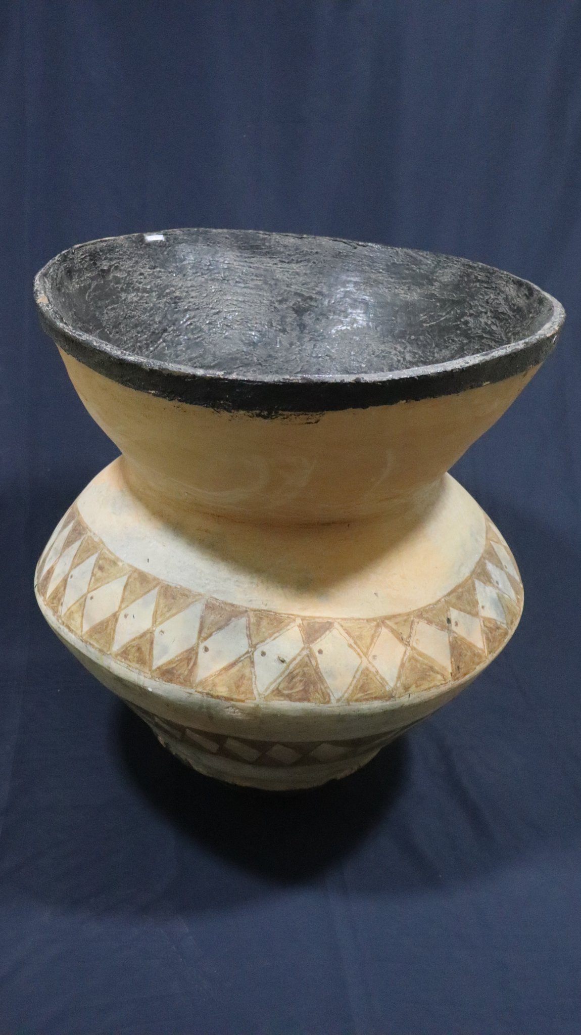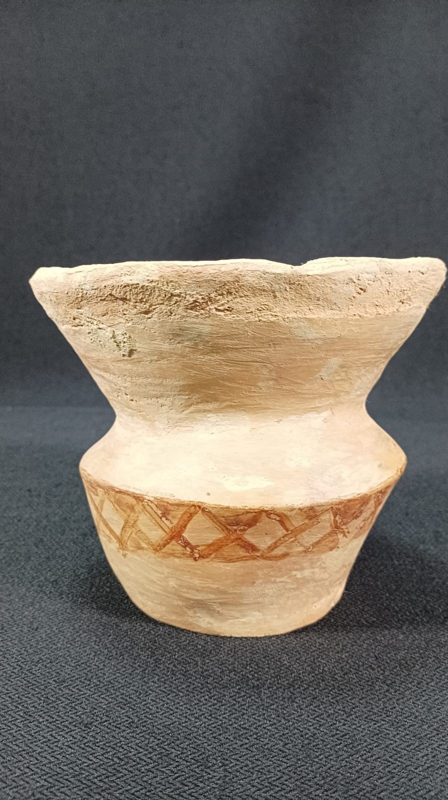 Pote de conformação trapezoidal, apresentando borda reta, bojo de contorno carenado e base plana. Confeccionado segundo a técnico do acordelado exibindo parte interna tingida com breu (preto) e bojo decorado com marcas de Kuahí, executados com tinta natural de Kumatê.