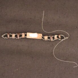 Pulseira recortes de coco de tucum constituída de escultura de peixe e recortes losangulares de coco não identificado intercaldos por sementes de graviola e pariri, sustentados por fio de nylon. Apresenta sobre a escultura, situada na parte central, o nome KUAHI gravado, atravessando a boca do animal haste de madeira marapinima. Exibe em uma das extremidades botão de casca de coco para fechamento da pulseira.