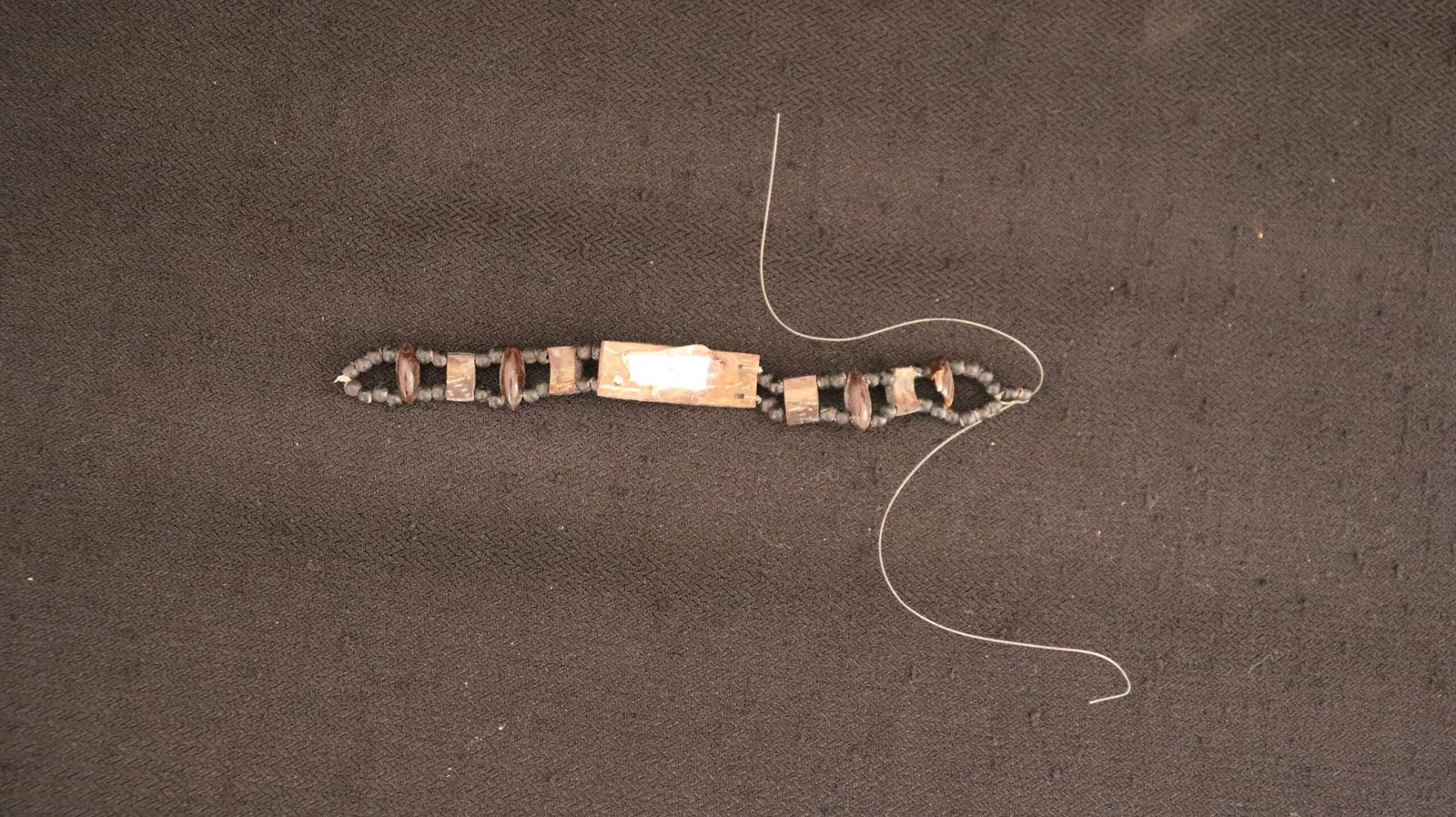 VEGETAL > Casca de semente não identificada | SINTÉTICO > Fio de nylon | VEGETAL > Madeira marapinima | VEGETAL > Semente de Graviola | VEGETAL > Semente de Pariri