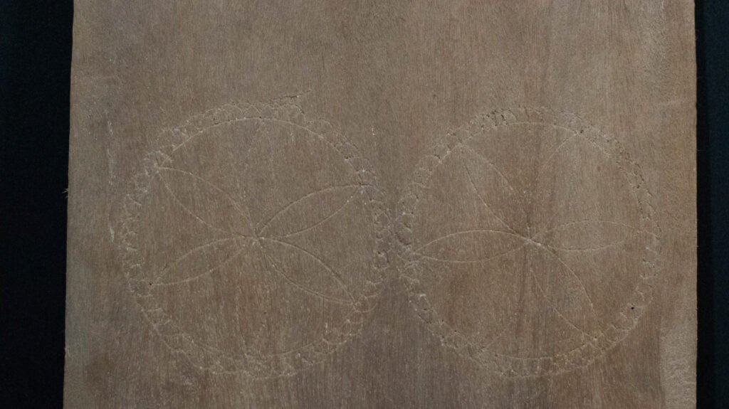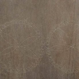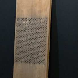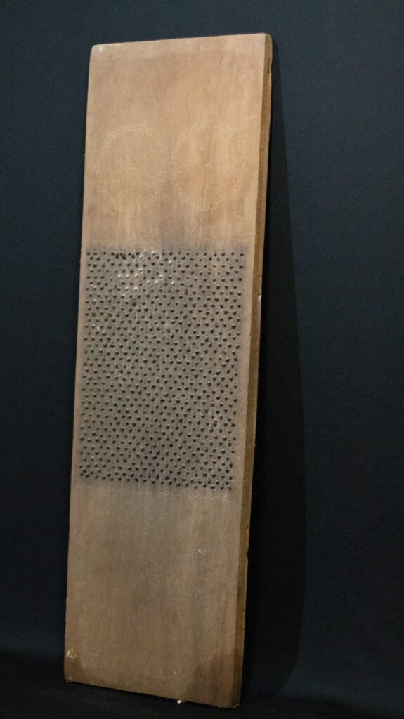 Ralador retangular plano confeccionado com madeira de louro apresentando embutido, no campo central, lascas de ferro extraidas de panelas de ferro usadas. Exibe sobre a superfície incisões em forma X.