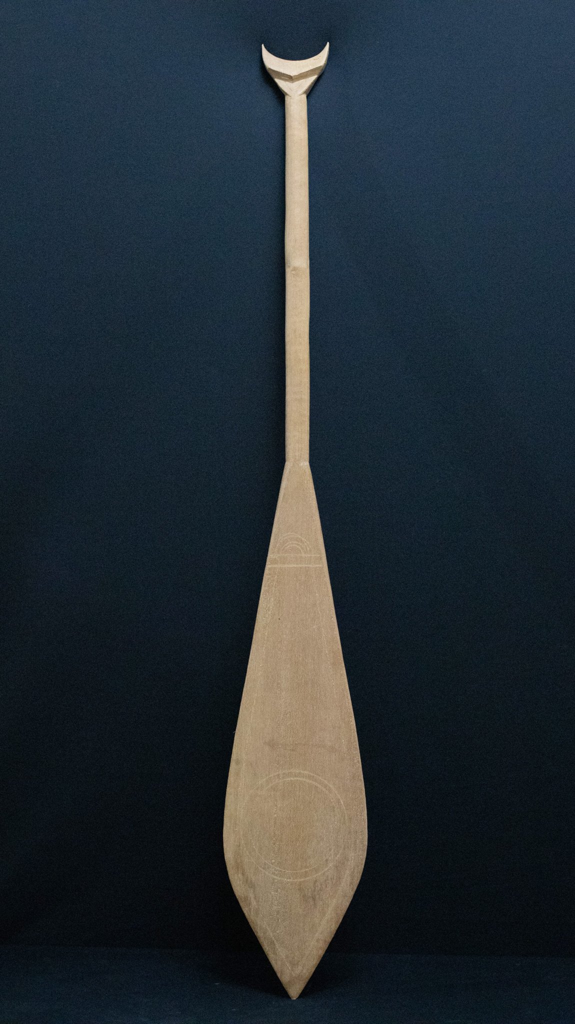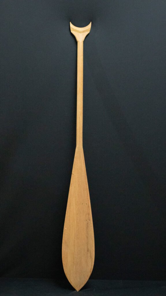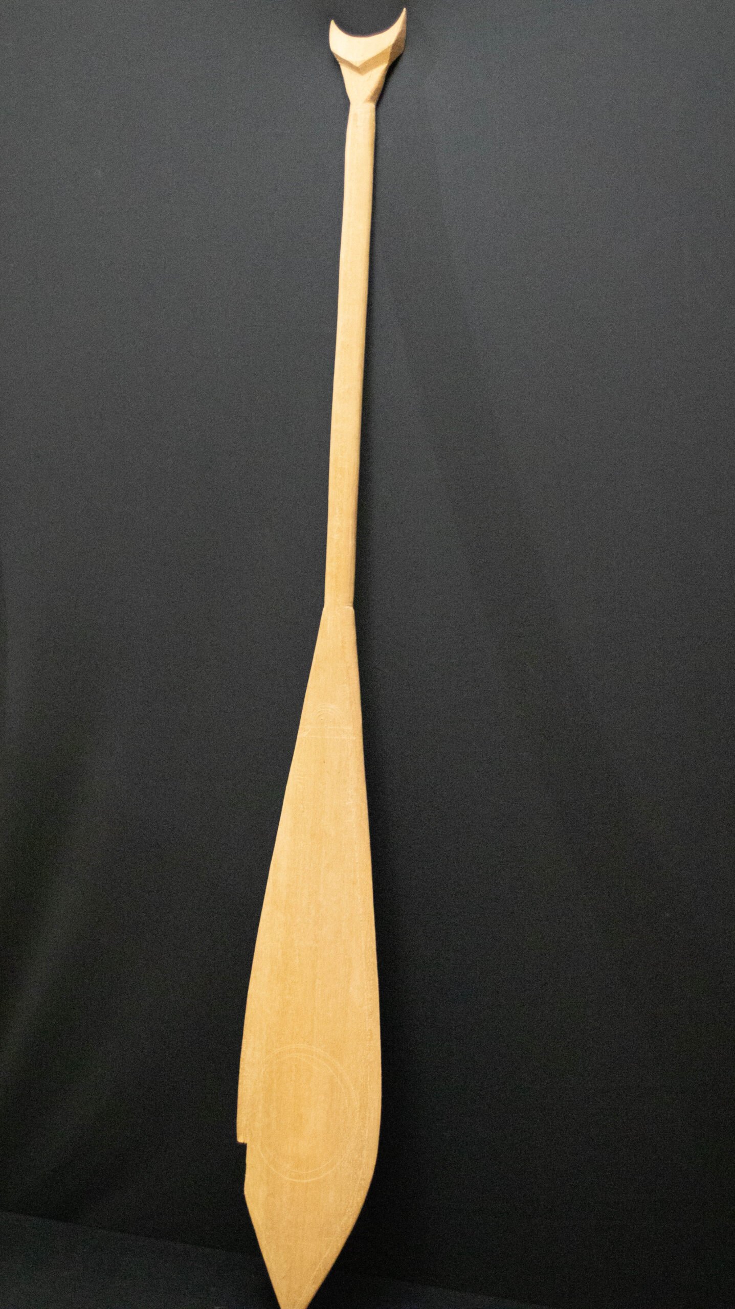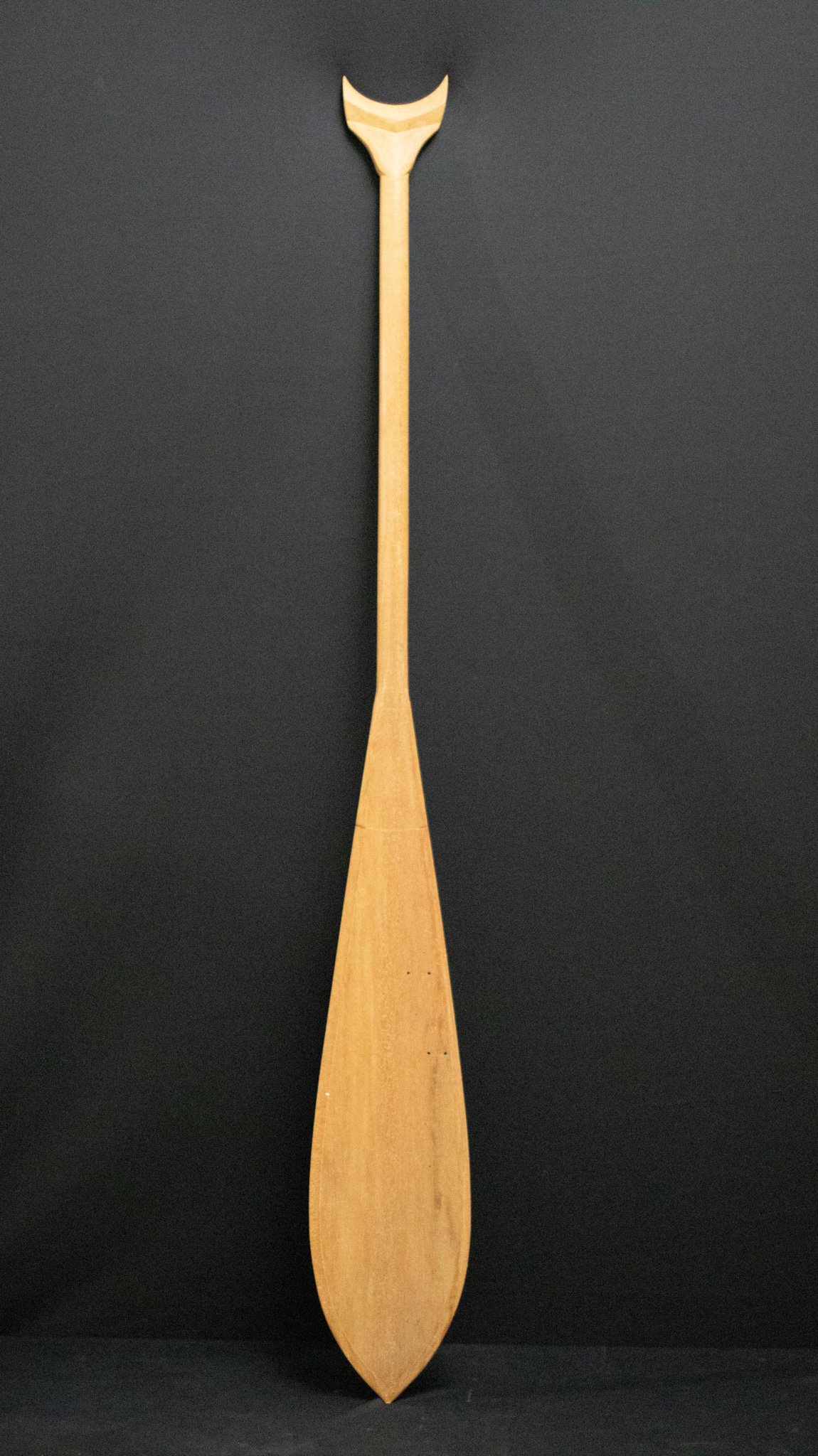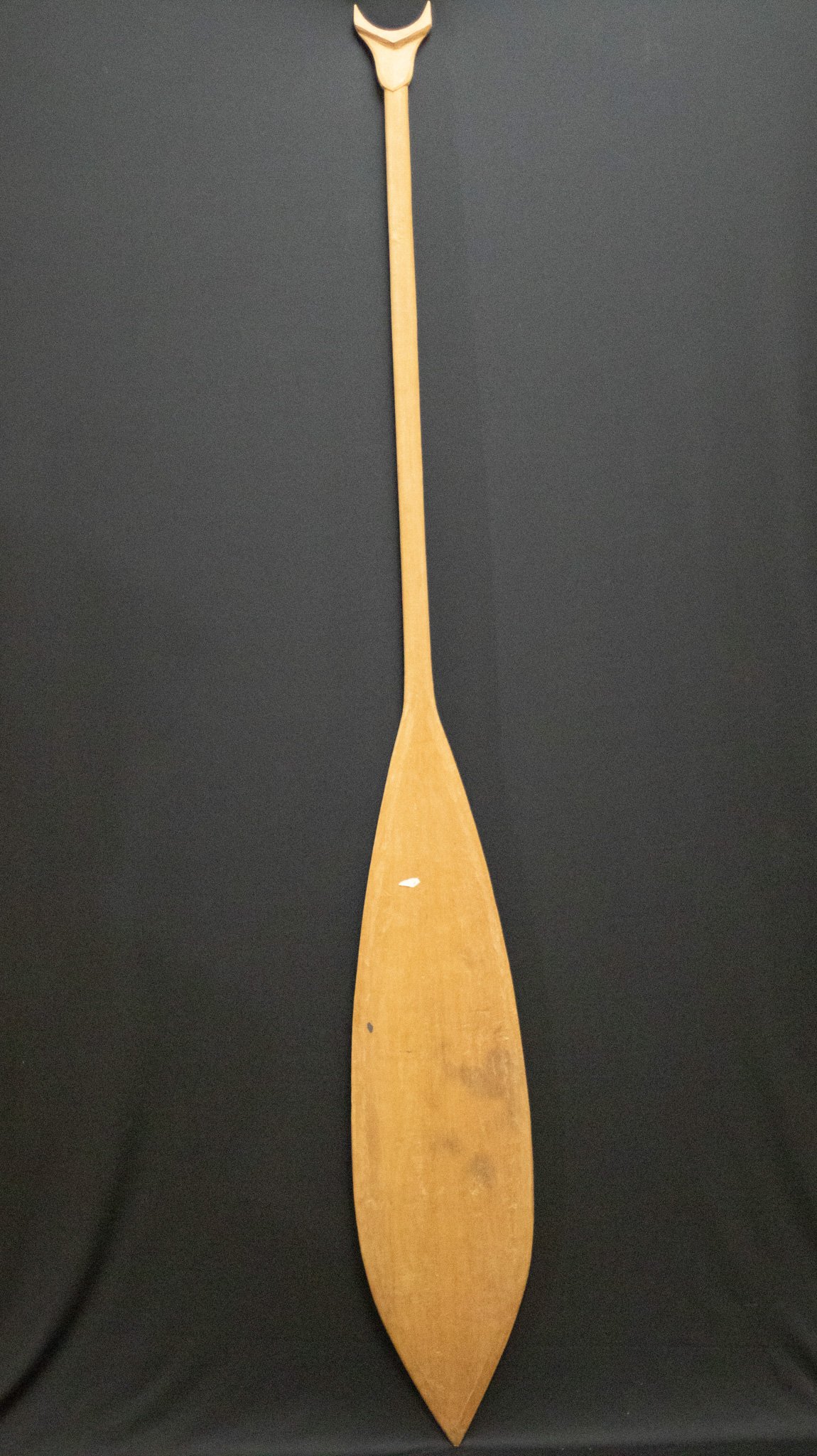Remo espatular confeccionado com madeira araroba apresentando pá espatulada, cabo roliço e punho em triangular.