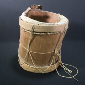 Tambor de pele constituído de cilindro de madeira não identificada, fechado em ambos os lados com membranas de couro de cobra sucuriju e de macaco guariba fixadas por compressão por meio de aro de madeira não identificada. Apresenta junto ao aro amarrações com fio de nylon e corda de curauá que se estende para caixa de ressonância cruzando sua superfície. Acompanha uma baqueta de madeira não identificada.