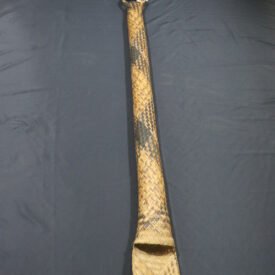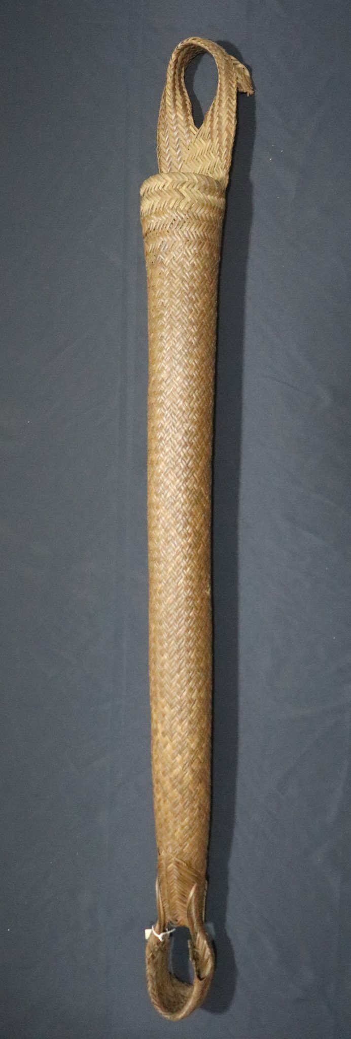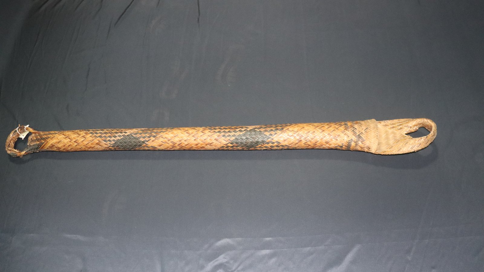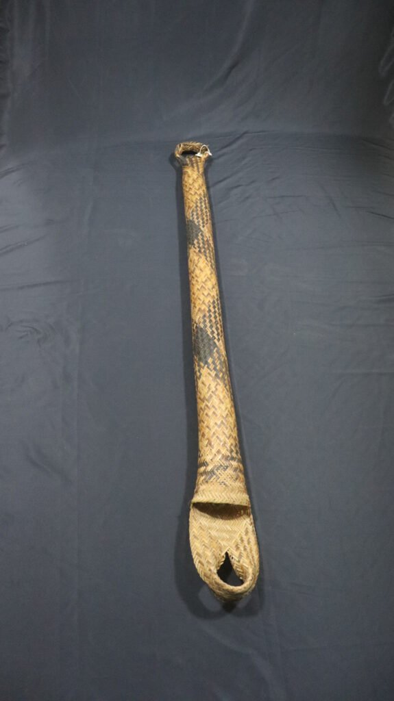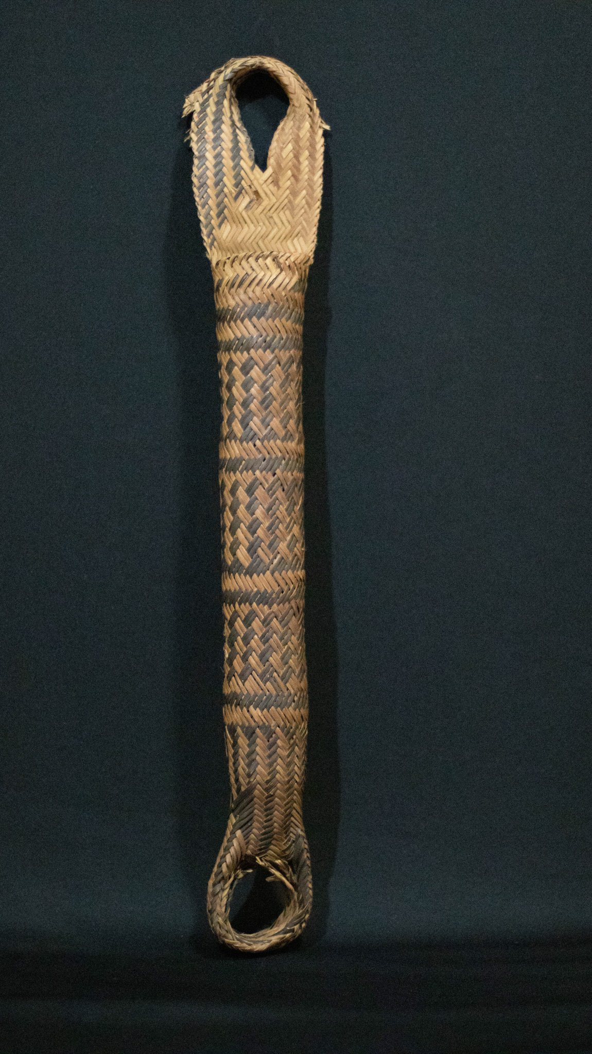 Tipiti constituído de tubo cilíndrico trançado com tala de guarumã, segundo a técnica do sarjado, nas cores natural e preto. Apresenta em uma das extremidade abertura para colocação da massa de mandioca e na outra, alça que serve de alavanca.