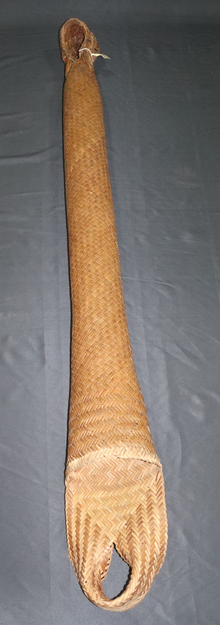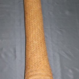 Tipiti constituído de tubo cilíndrico trançado com tala de guarumã, segundo a técnica do sarjado formando padrões peito de camarão e escama de tamatá. Apresenta em uma das extremidade abertura para colocação da massa de mandioca e na outra, alça que serve de alavanca.